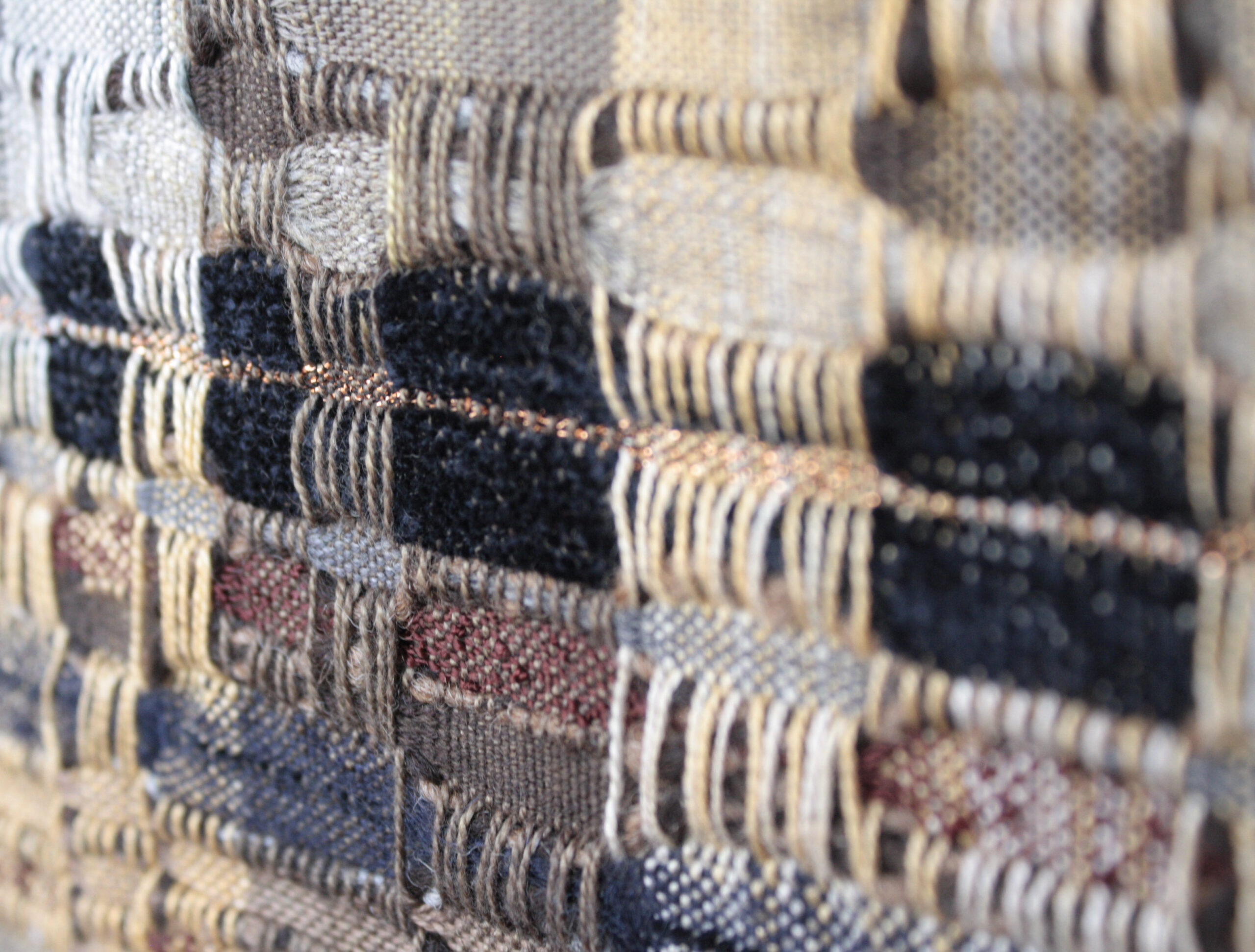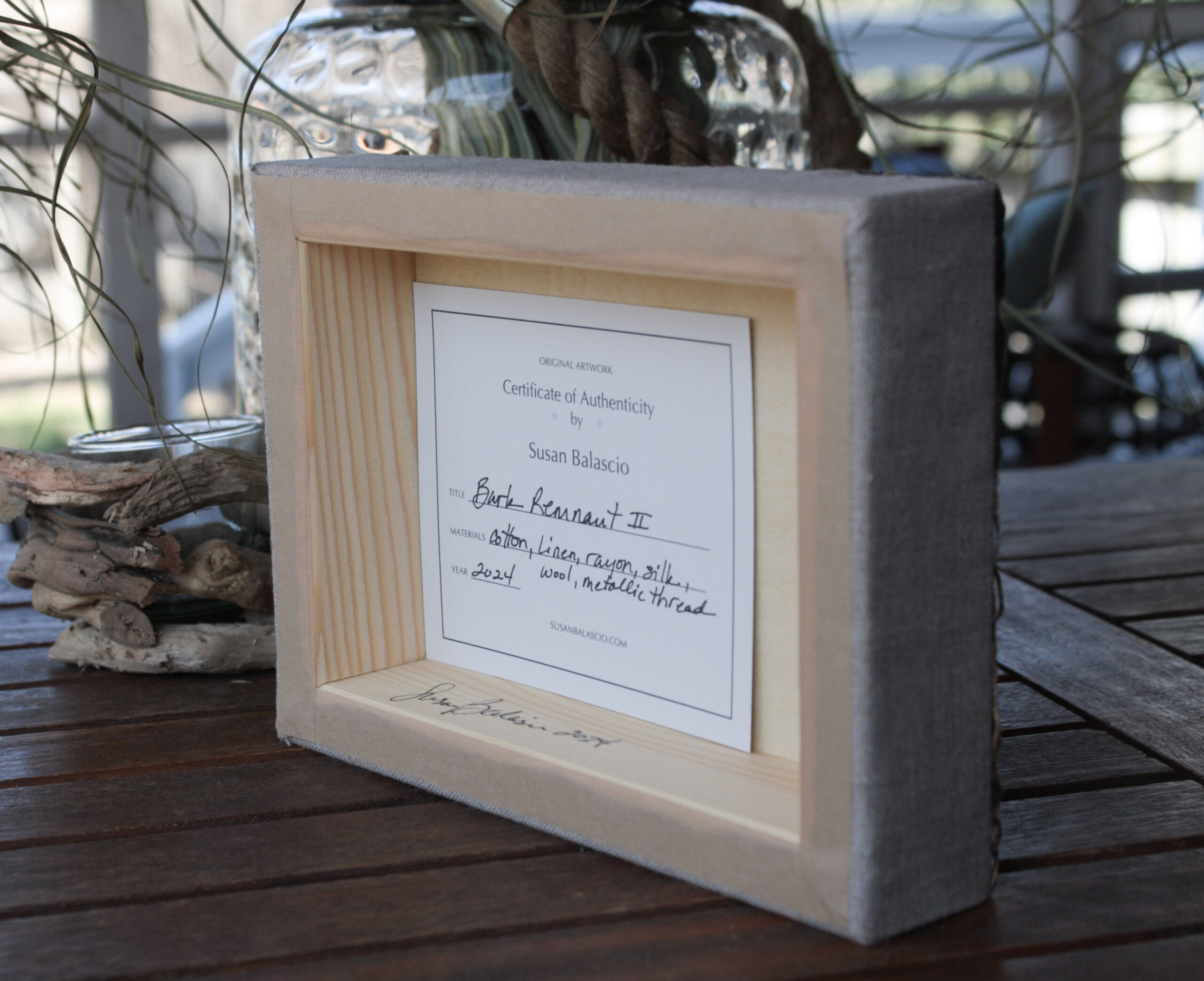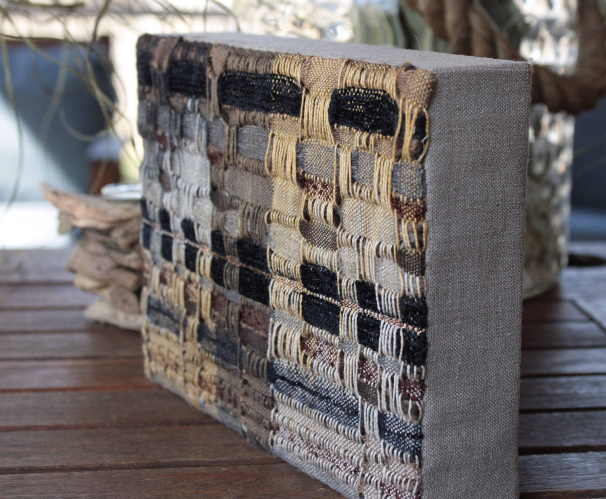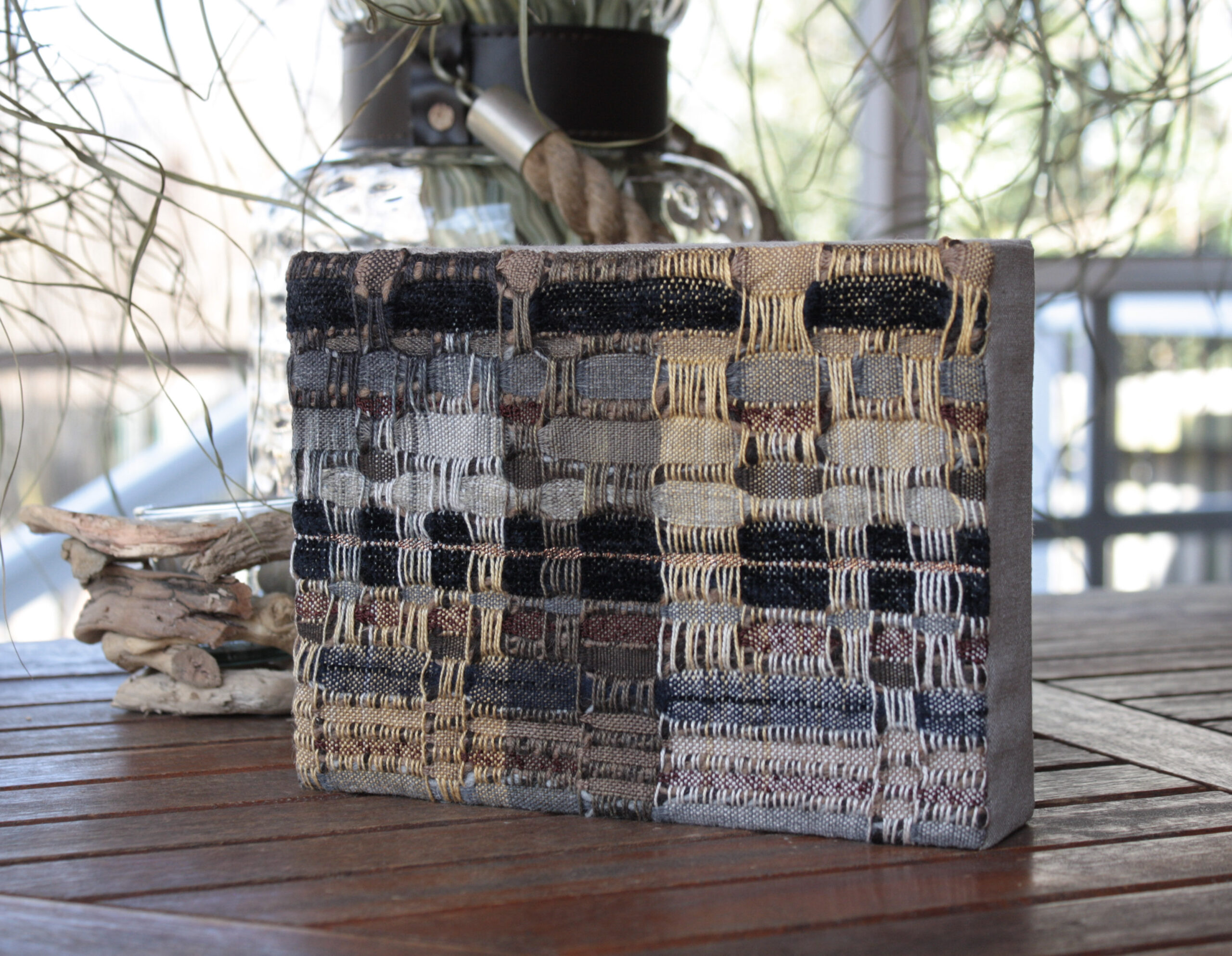 Beautifully detailed hand-dyed and woven piece, mounted on linen-covered frame. A small gem that will look beautiful on the wall or on a shelf!