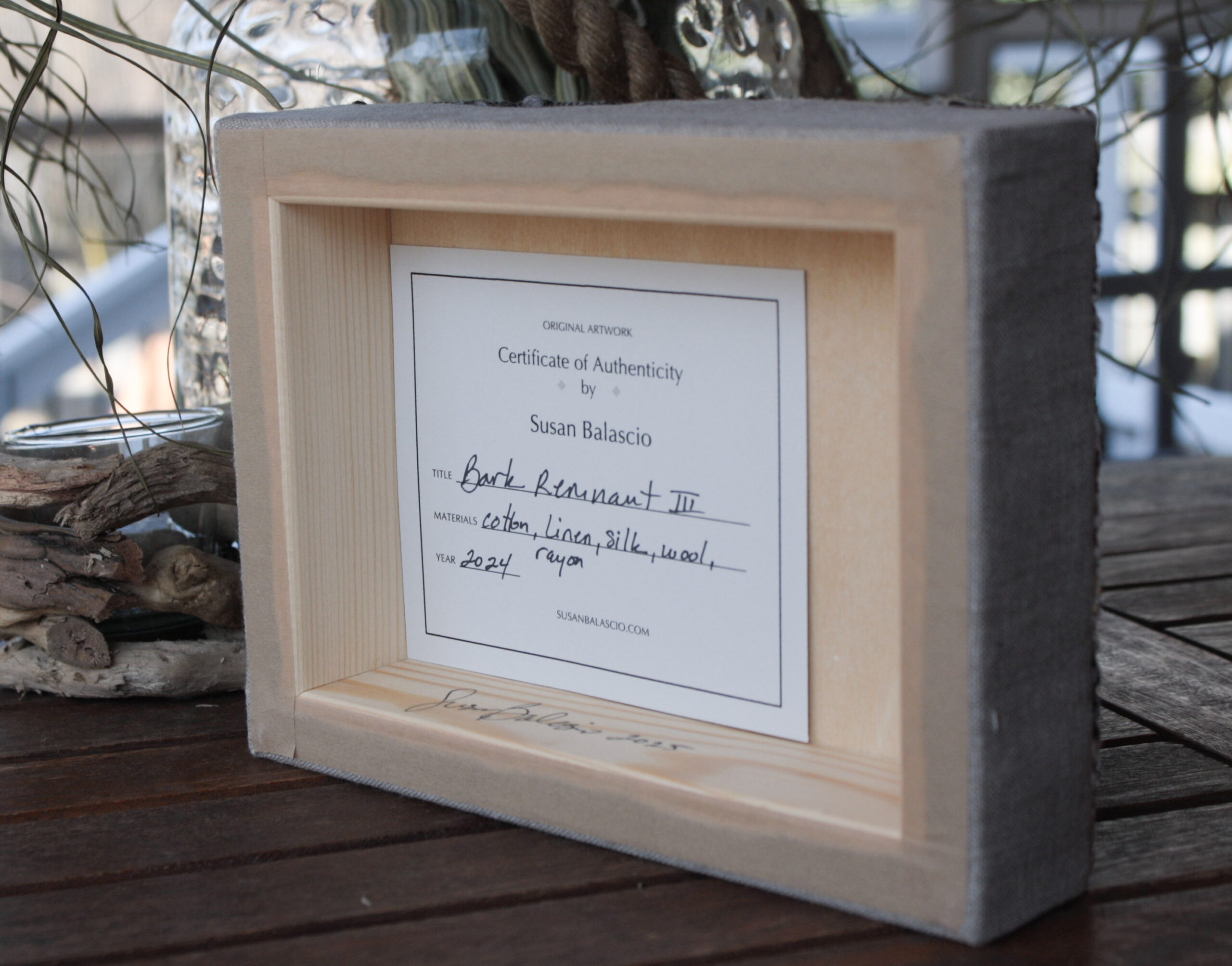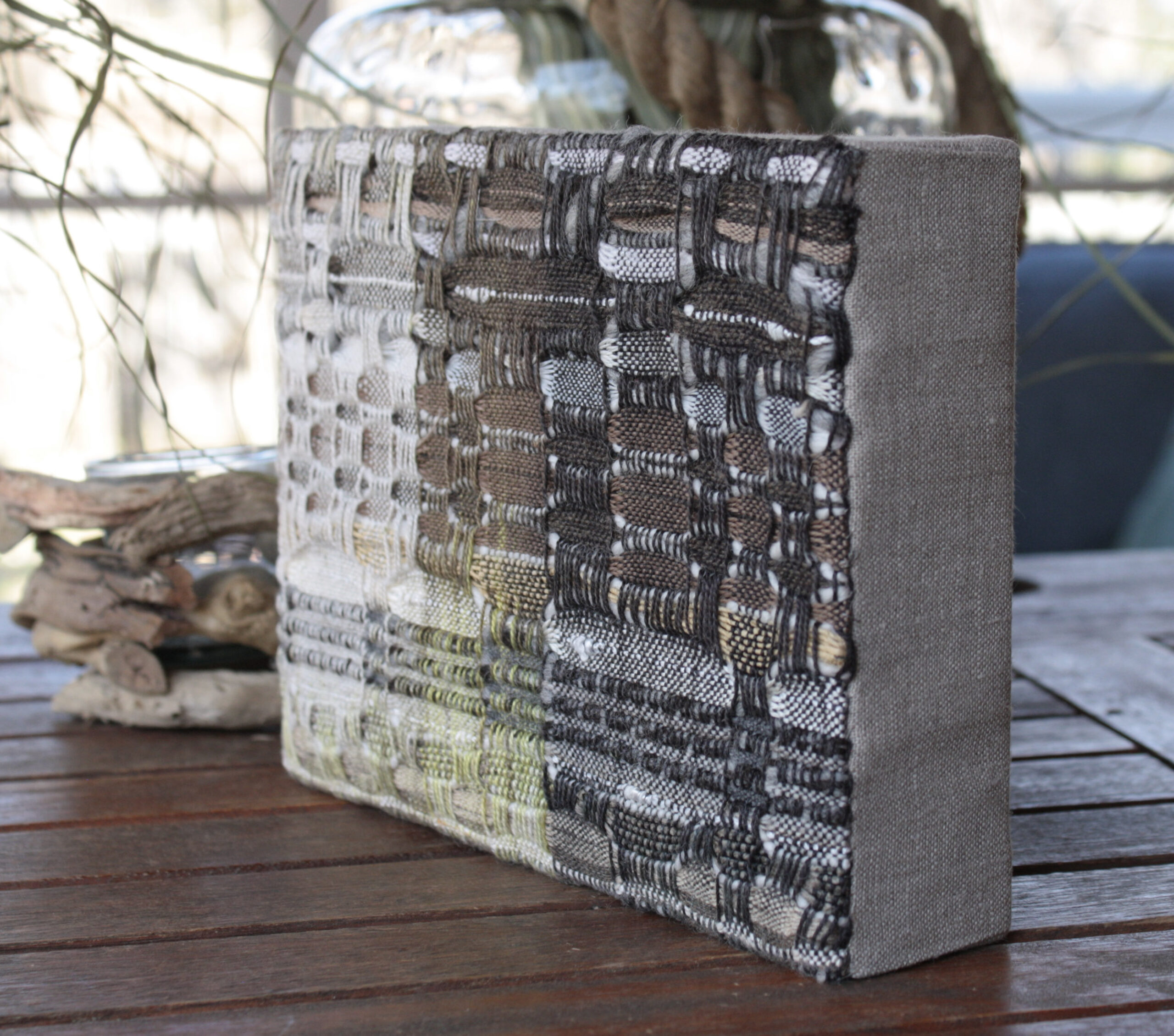 Beautifully detailed hand-dyed and woven piece, mounted on linen-covered frame. A small gem that will look beautiful on the wall or on a shelf!