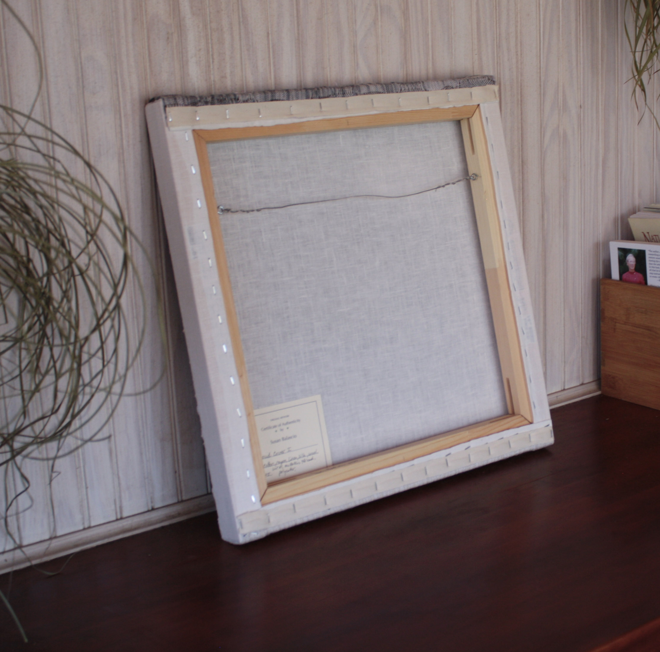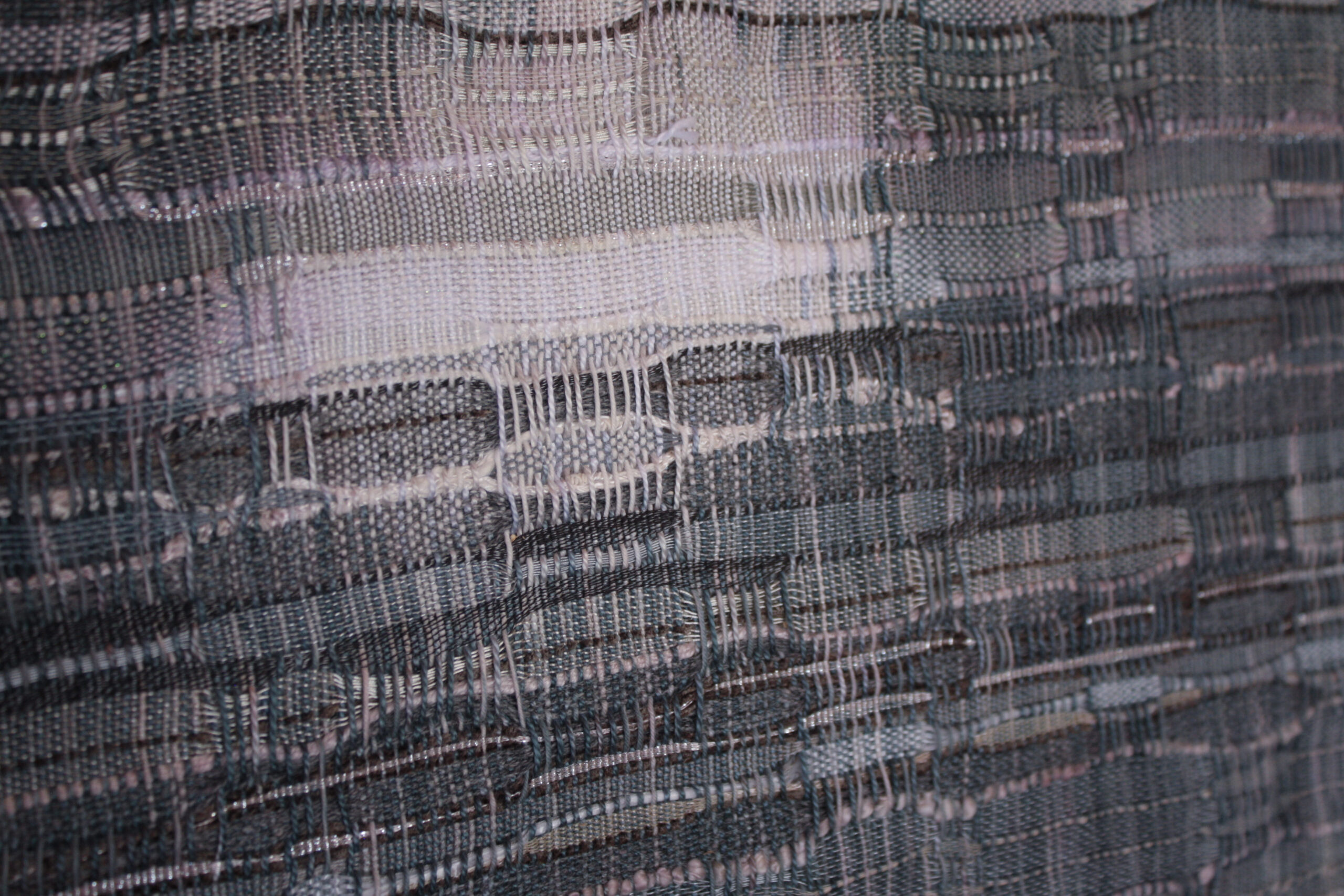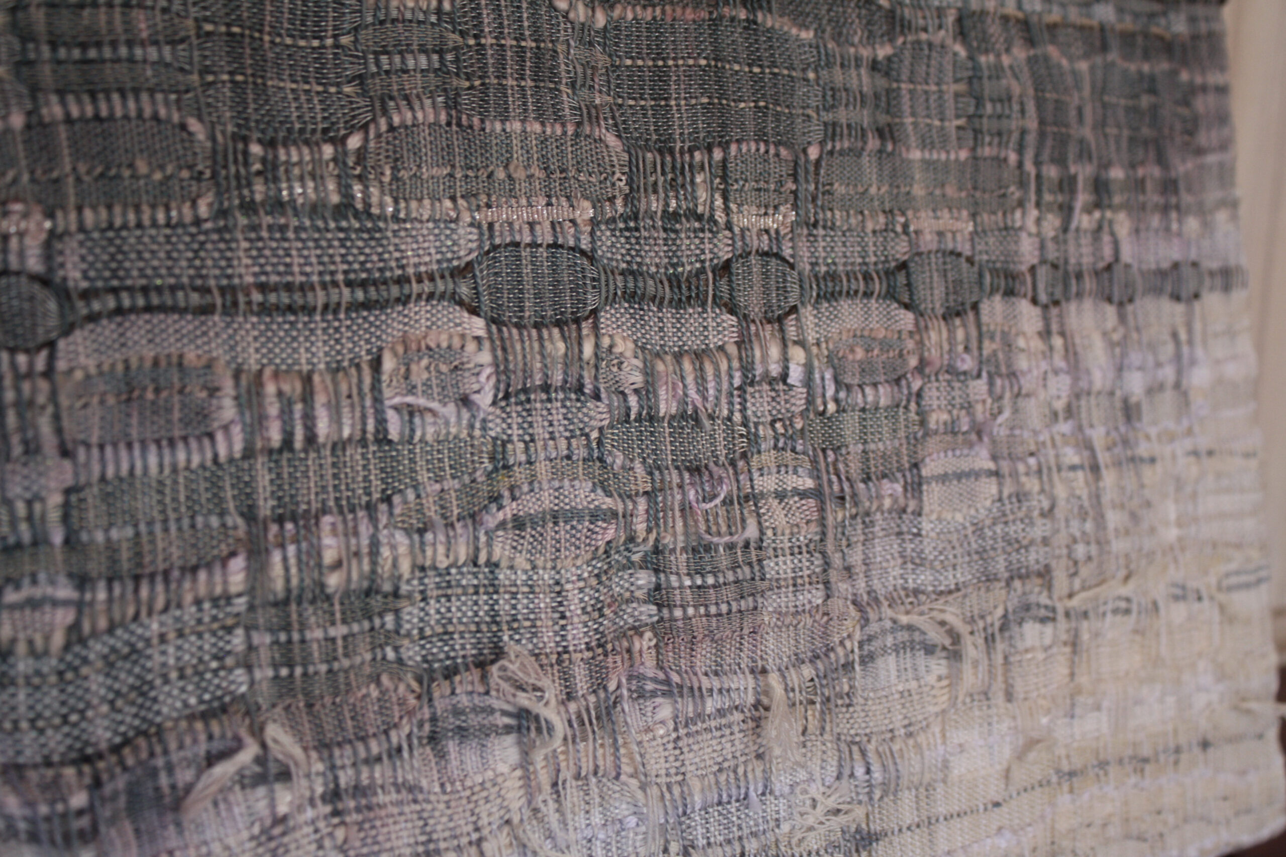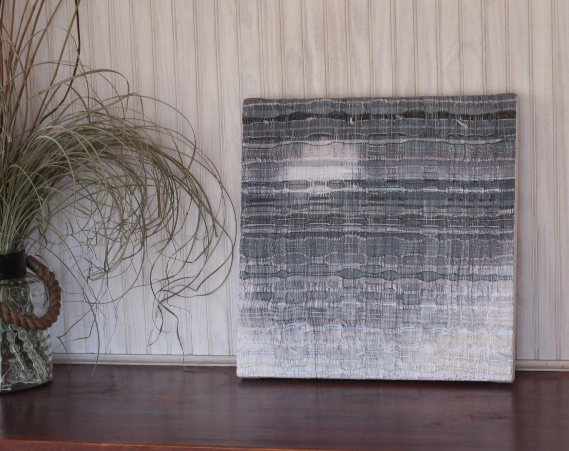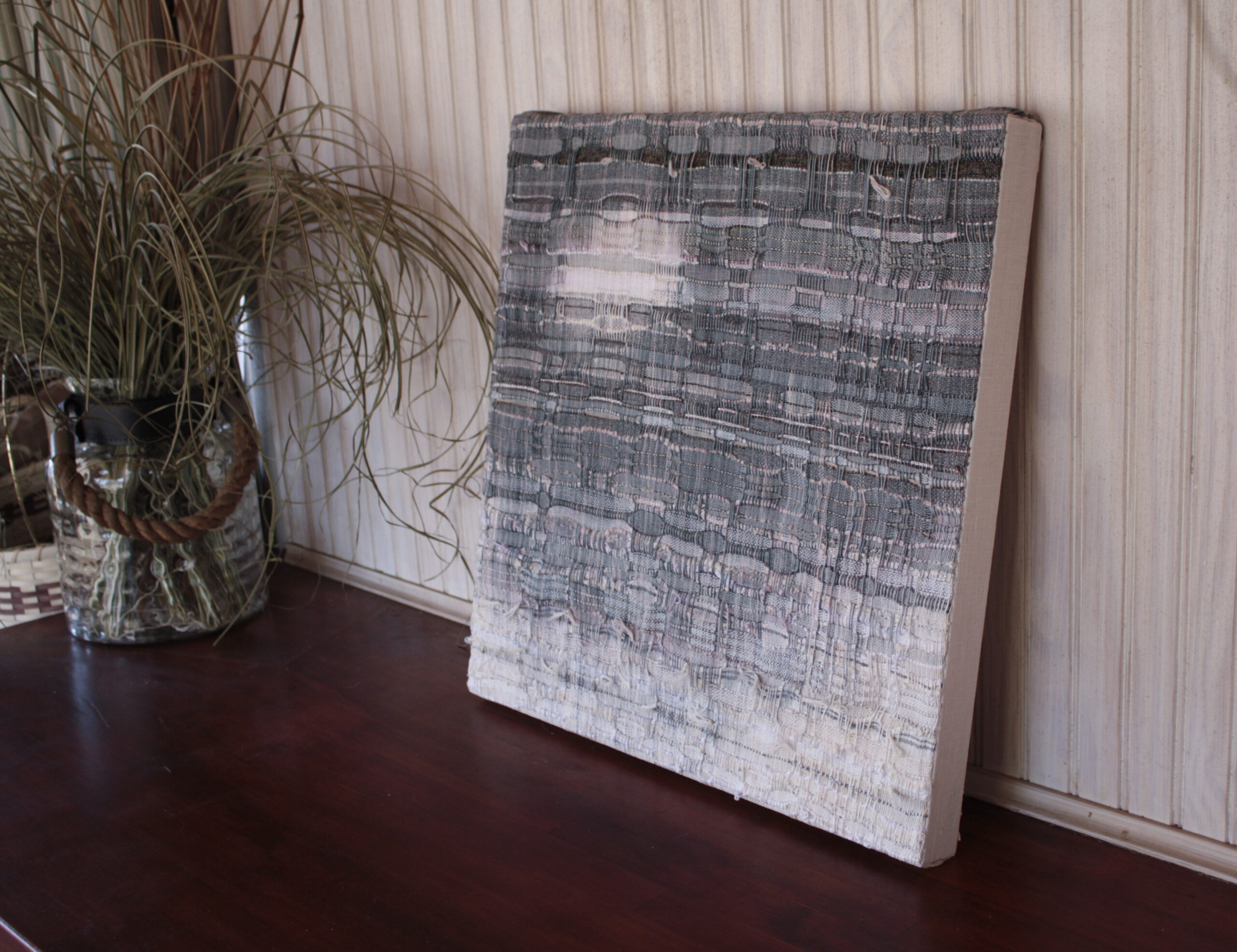 One of four in a series on clouds. Hand-painted warp, handwoven art. Mounted on a linen-covered frame, ready to hang.