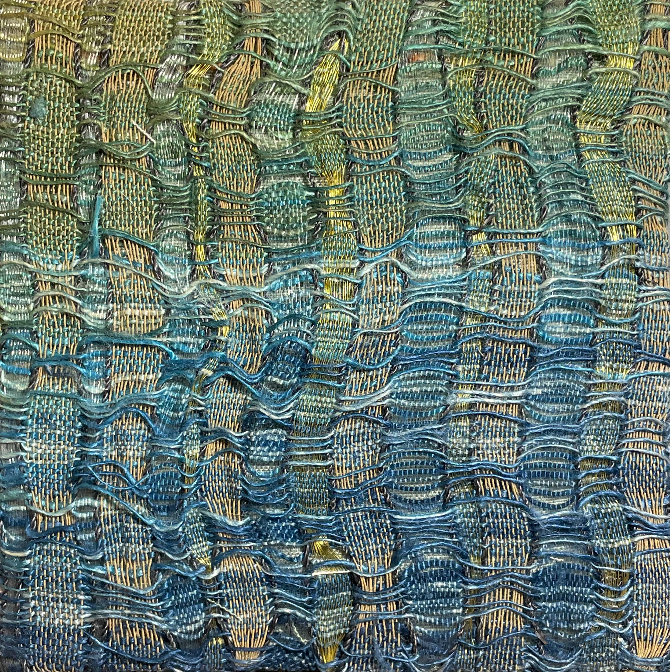 Beautifully detailed hand-dyed and woven piece, mounted on linen-covered frame. Reminiscent of the ocean, this small gem will look beautiful on the wall or on a shelf!